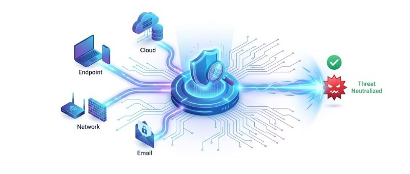 Rozwiązanie integrujące dane z wielu warstw ochrony (punkty końcowe, sieć, chmura), zapewniając pełną widoczność i automatyczną reakcję na złożone cyberataki.